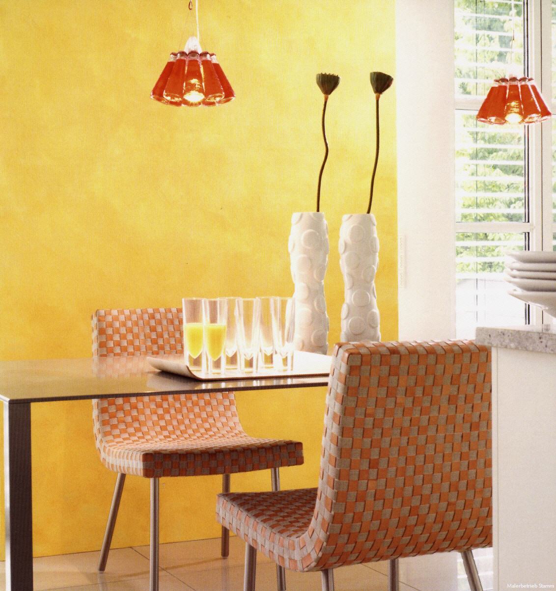 Man muß nicht in Italien leben, um einen Platz an der Sonne zu haben. Die positive Ausstrahlung der Farbe Gelb wird durch eine Lasur noch intensiviert. Ein fein gekörnter, mineralischer Streichputz unterstützt die natürliche und lebendige Wirkung einer Akzentwand.