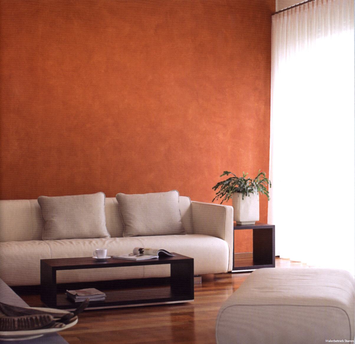 Entspannend und anregend zugleich ist diese gelungene Kombination von Strukturen und Farbigkeiten. Gerade zu ruhigen glatten Oberflächen wie Holzparkett, Couchtisch und Ledersofa steht die fein-wolkig lasierte Wand in reizvollem Kontrast. Durch zweifachen Lasurauftrag erhält die Akzentwand eine feurig-mystische Tiefe, die dem Raum Leben einhaucht und die Möbel erst so richtig zur Geltung bringt.