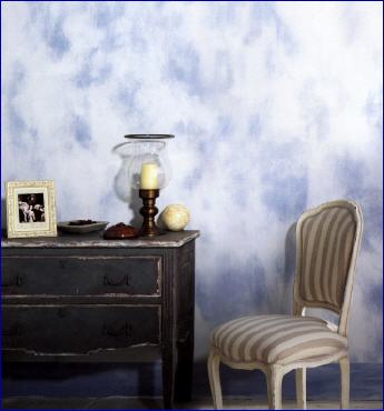 Die Technik besteht im wesentlichen darin, erst eine Grundfarbe - hier ist es ein Pastellblau - aufzubringen, darauf eine Deckfarbe, die anschließend partiell mit einem abrasiven Schwamm wieder abgerieben, bzw. abgewaschen wird, dass die Untergrundfarbigkeit hindurch schimmert. Es entstehen wolkige Flächen mit ungewöhnlich interessanten farbigen Schattierungen.