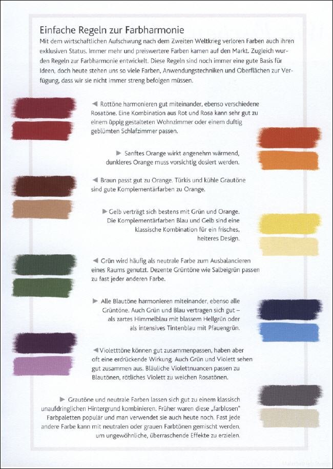 ein gutes Handbuch... mit vielen Beispielen gelungener Farbkombinationen und -harmonien, unterteilt nach Farbgruppen. Das handliche kleine Buch ist sowohl für "Laien" als auch Profis eine gute Orientierung |