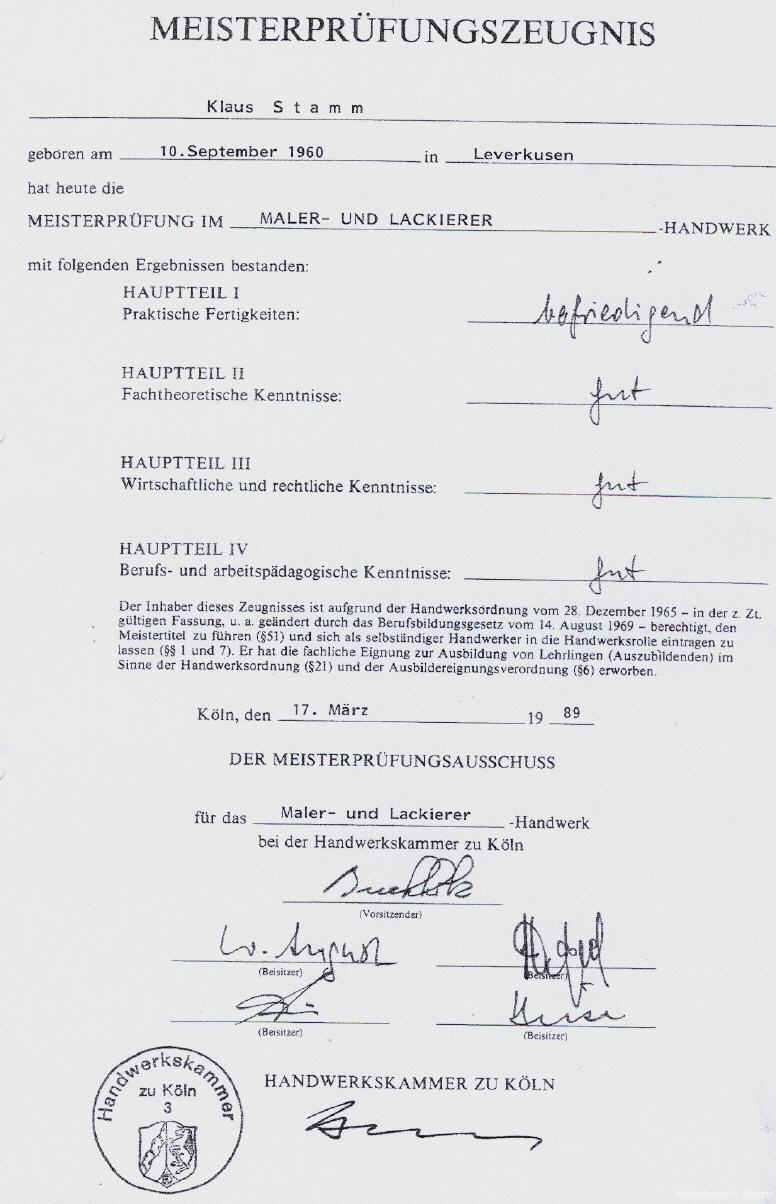 Öffentliche Bestellung und Vereidigung zum Sachverständigen im Maler- und Lackiererhandwerk durch die Handwerkskammer zu Köln.